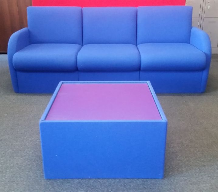 This Second Hand Reception Suit consists of three deeply cushioned modular seats which form a sofa, and a square glass coffee table, all upholstered in 'Clipper' blue fabric. In good condition, this used reception suite is also available for a heavily discounted price!
